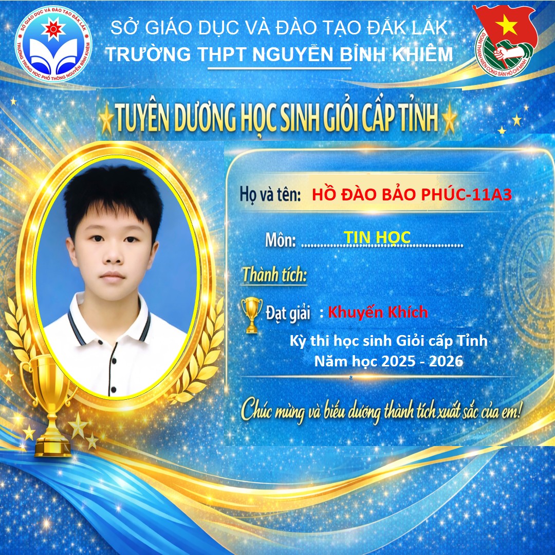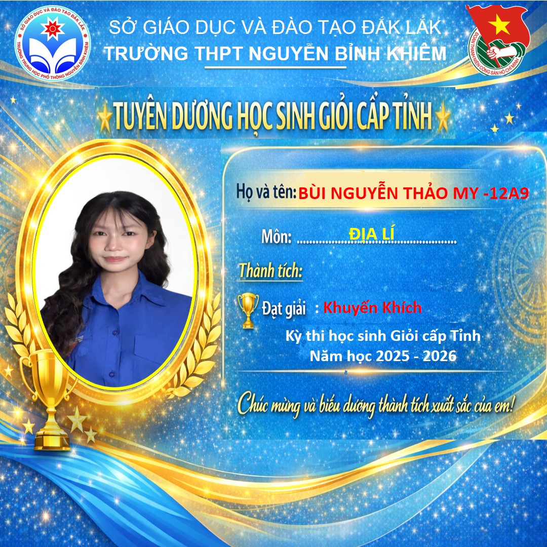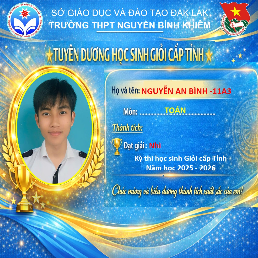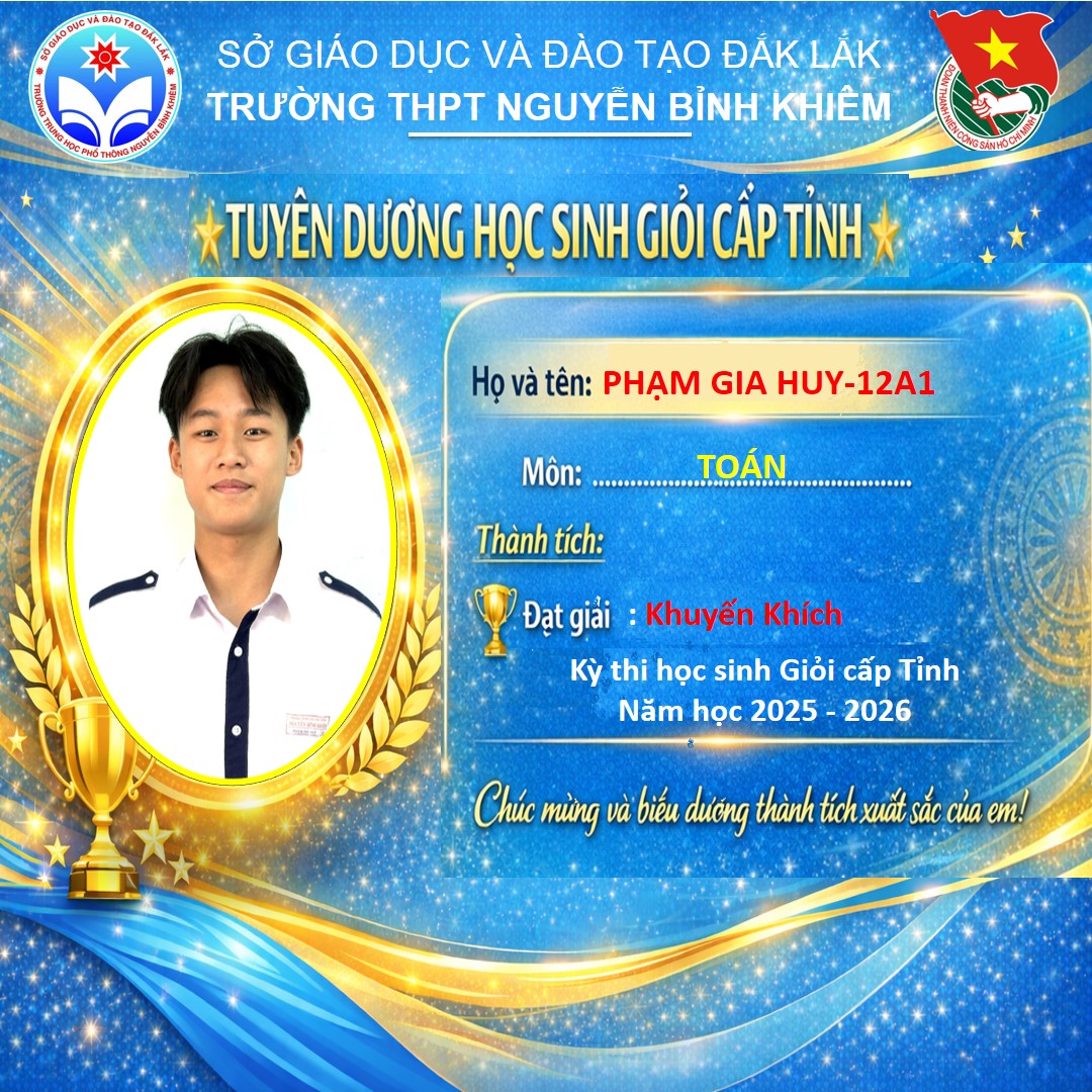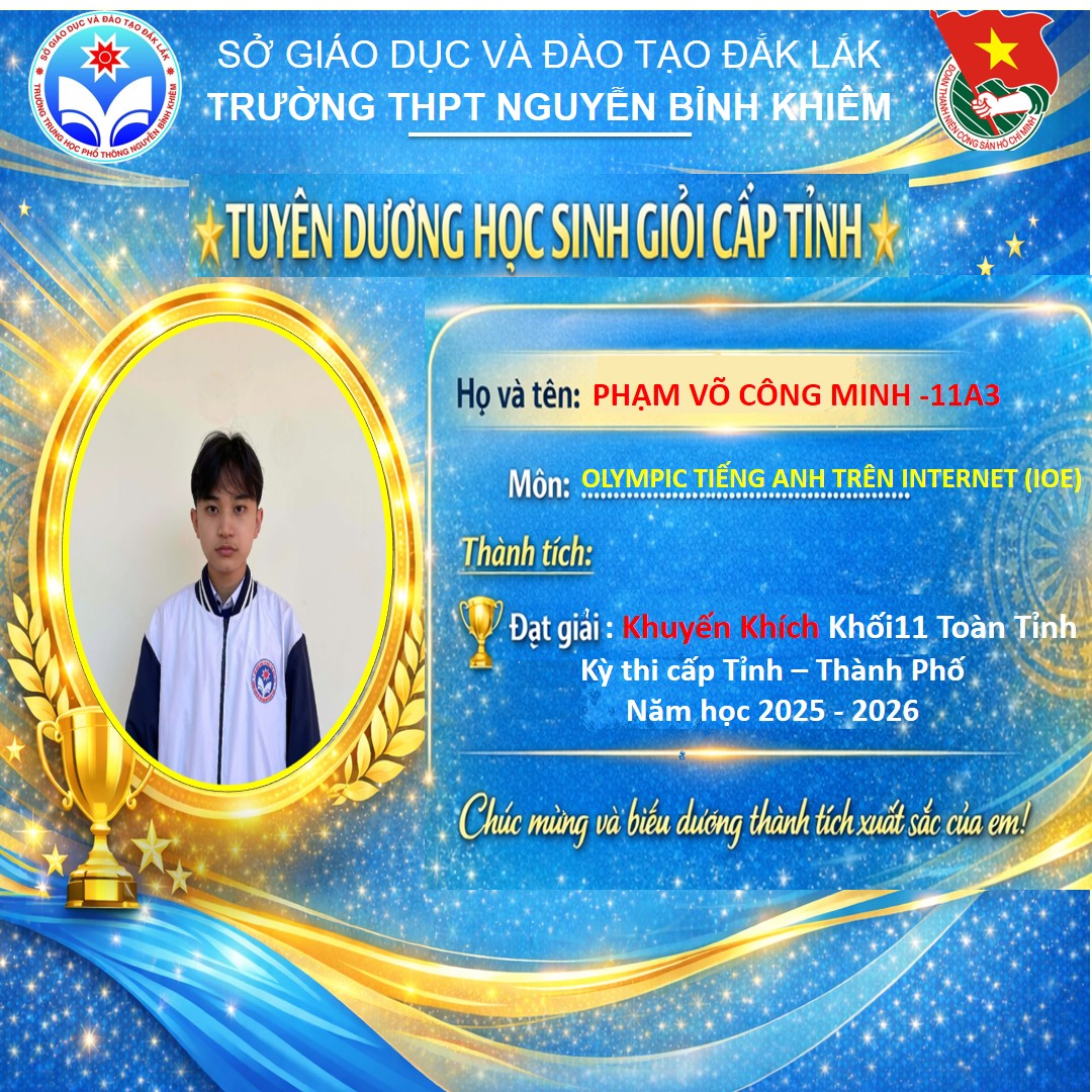 Hòa chung không khí thi đua sôi nổi của tuổi trẻ cả nước, sáng ngày 26/03/2026 Trường THPT Nguyễn Bỉnh Khiêm đã long trọng tổ chức LỄ KỶ NIỆM 95 NĂM NGÀY THÀNH LẬP ĐOÀN TNCS HỒ CHÍ MINH (26/3/1931 – 26/3/2026) và TUYÊN DƯƠNG HỌC SINH GIỎI CẤP TỈNH trong các kỳ thi năm học 2025 – 2026.