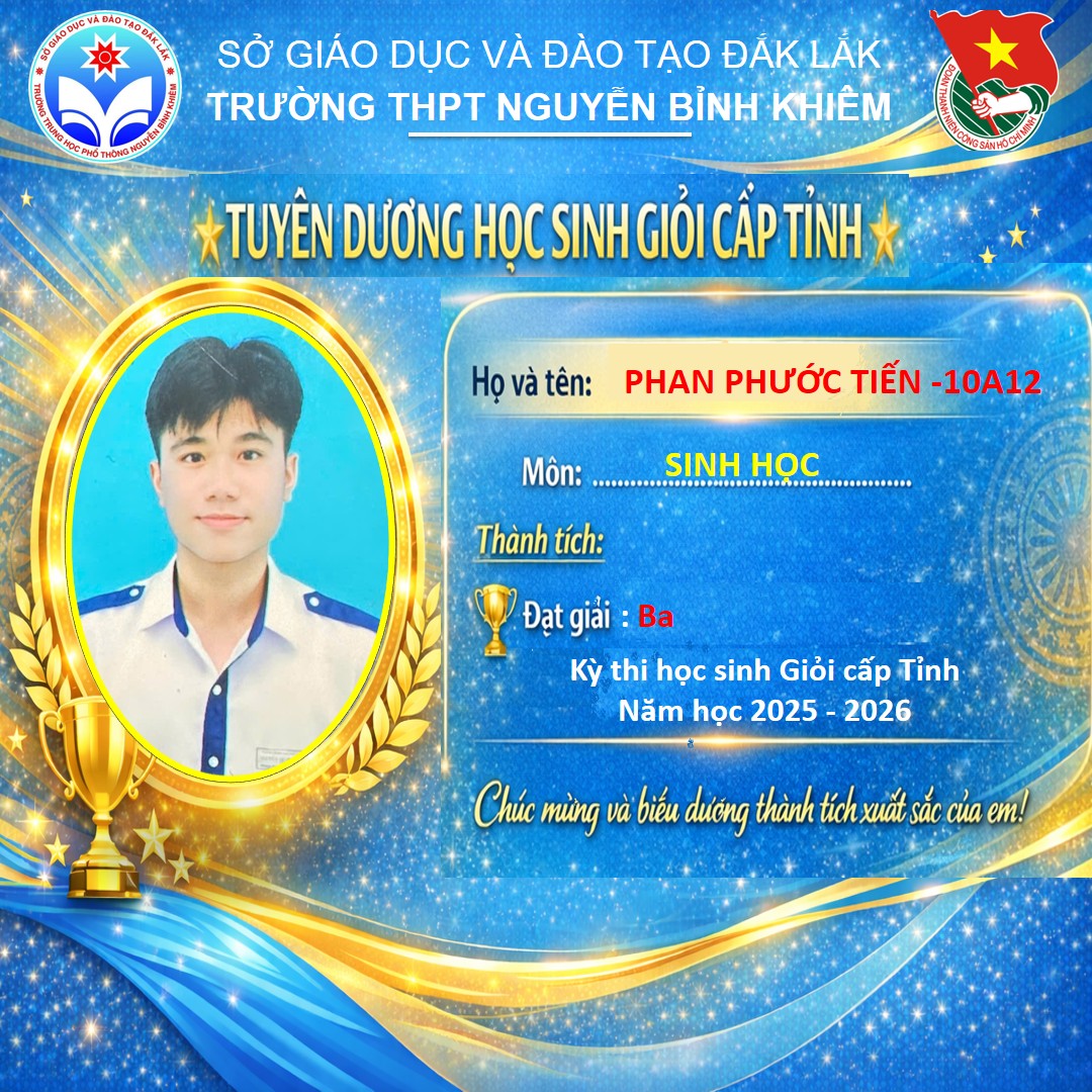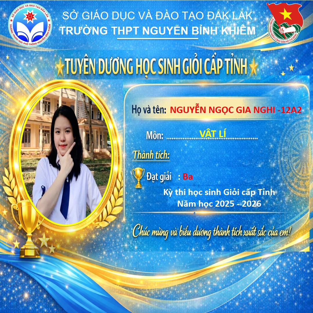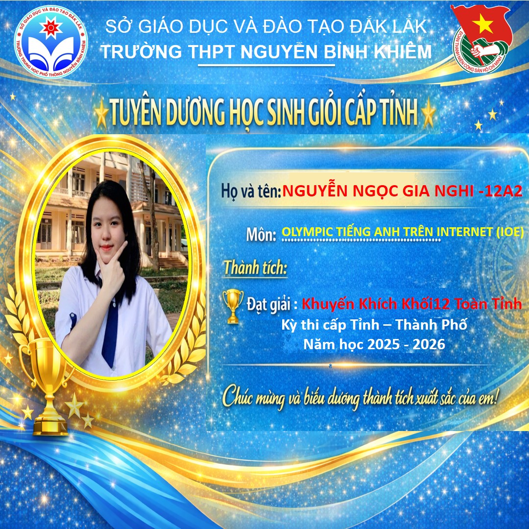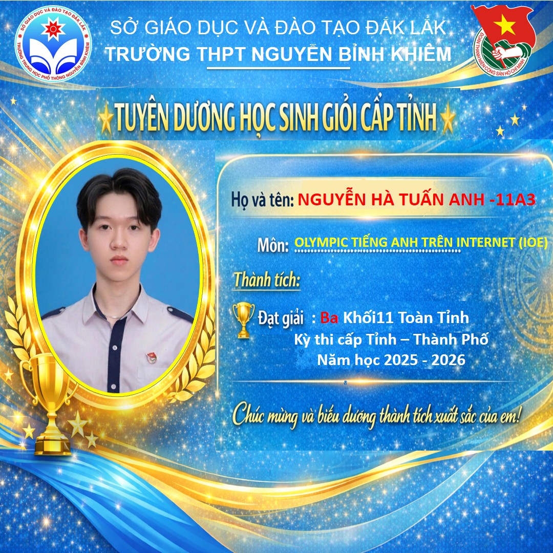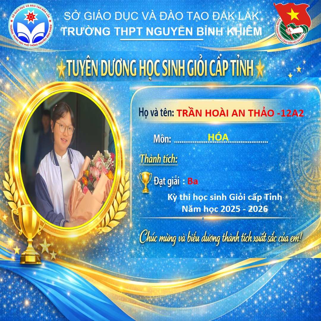 Hòa chung không khí thi đua sôi nổi của tuổi trẻ cả nước, sáng ngày 26/03/2026 Trường THPT Nguyễn Bỉnh Khiêm đã long trọng tổ chức LỄ KỶ NIỆM 95 NĂM NGÀY THÀNH LẬP ĐOÀN TNCS HỒ CHÍ MINH (26/3/1931 – 26/3/2026) và TUYÊN DƯƠNG HỌC SINH GIỎI CẤP TỈNH trong các kỳ thi năm học 2025 – 2026.