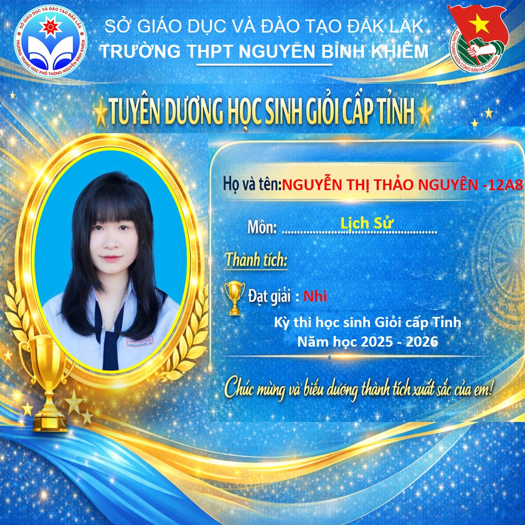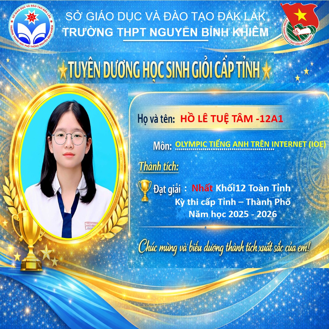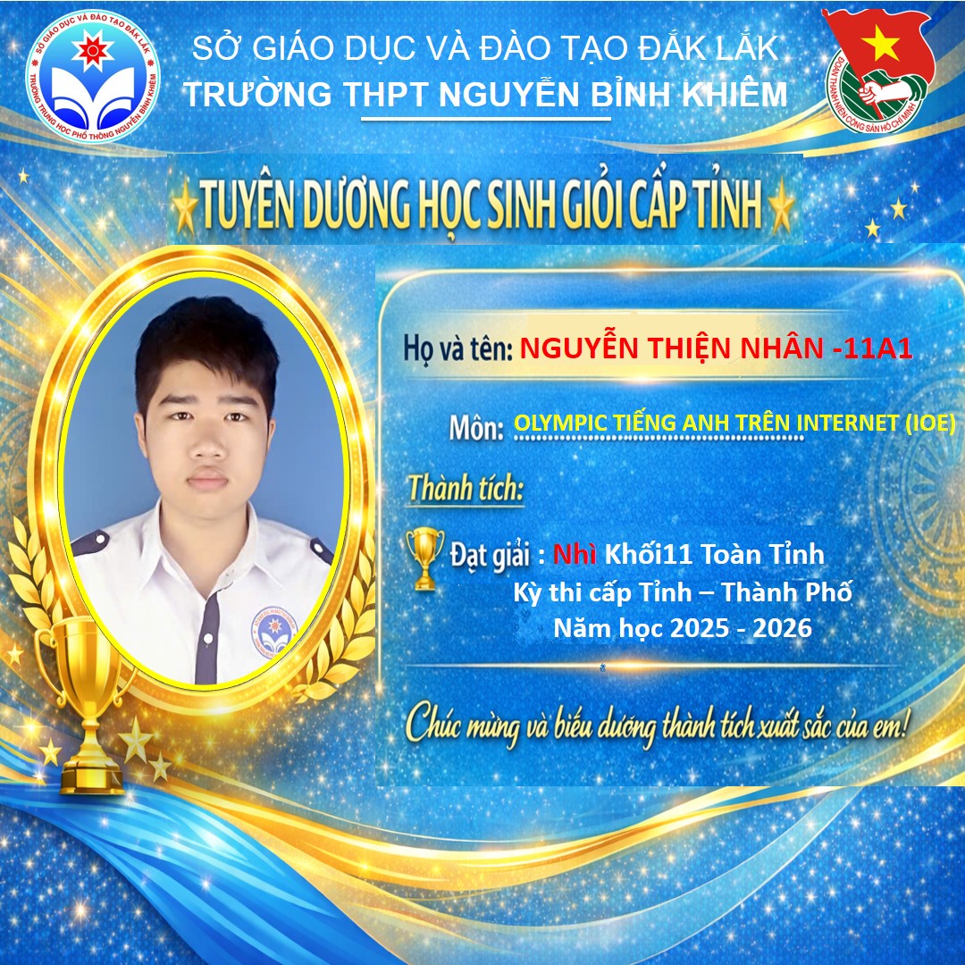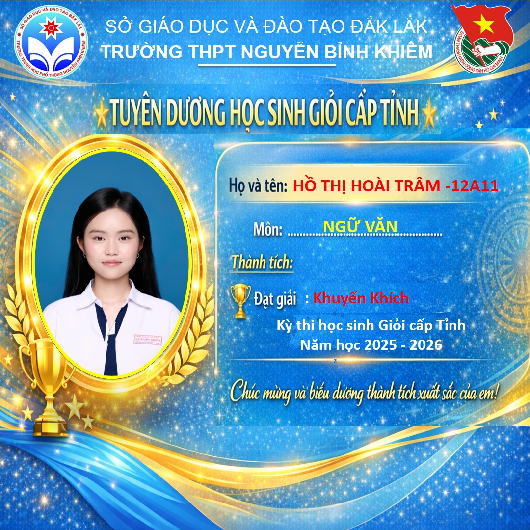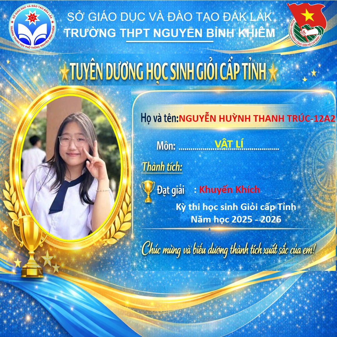 Hòa chung không khí thi đua sôi nổi của tuổi trẻ cả nước, sáng ngày 26/03/2026 Trường THPT Nguyễn Bỉnh Khiêm đã long trọng tổ chức LỄ KỶ NIỆM 95 NĂM NGÀY THÀNH LẬP ĐOÀN TNCS HỒ CHÍ MINH (26/3/1931 – 26/3/2026) và TUYÊN DƯƠNG HỌC SINH GIỎI CẤP TỈNH trong các kỳ thi năm học 2025 – 2026.