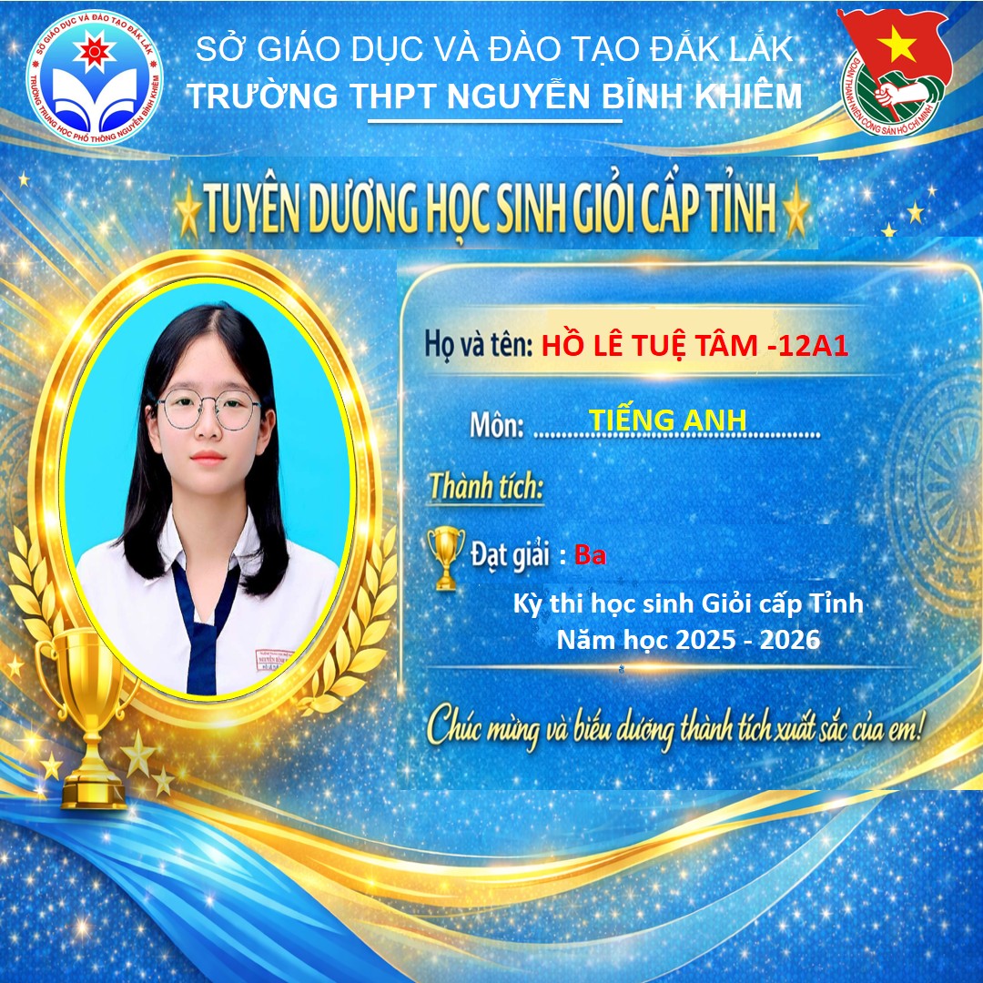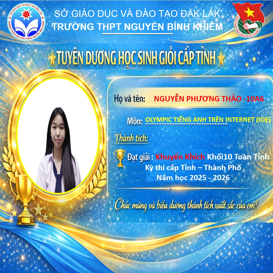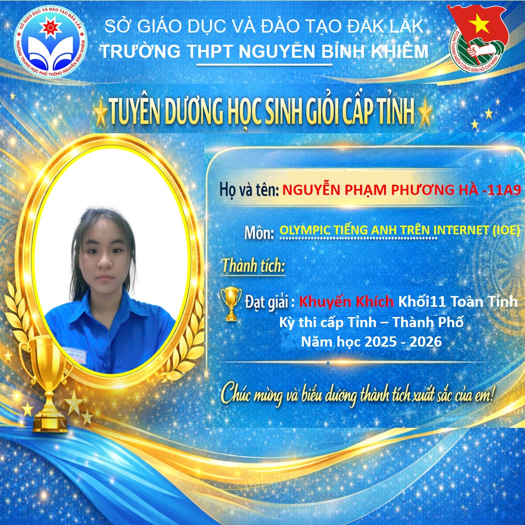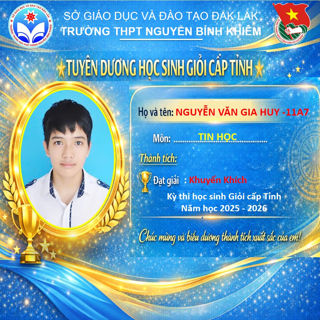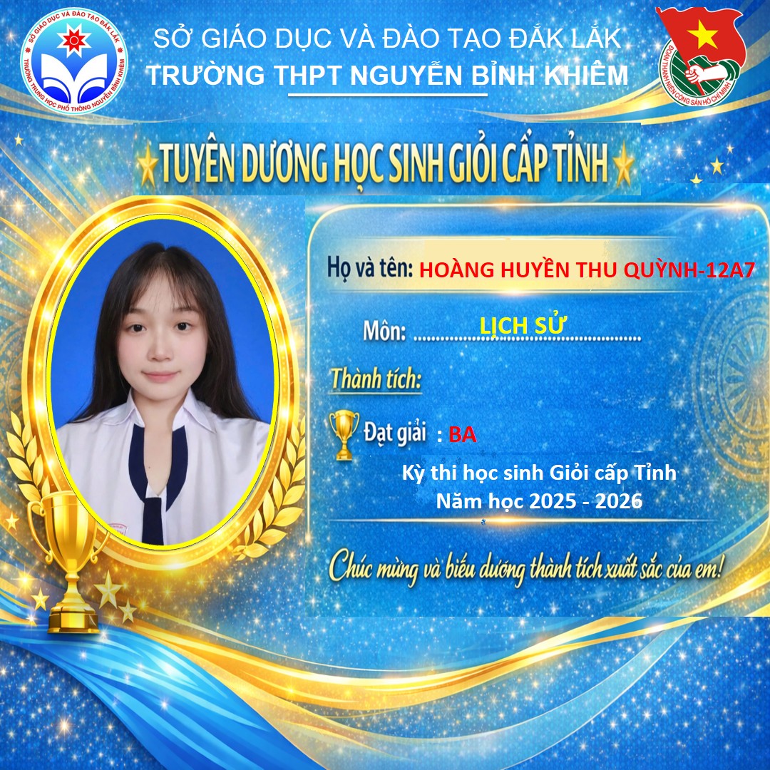 Hòa chung không khí thi đua sôi nổi của tuổi trẻ cả nước, sáng ngày 26/03/2026 Trường THPT Nguyễn Bỉnh Khiêm đã long trọng tổ chức LỄ KỶ NIỆM 95 NĂM NGÀY THÀNH LẬP ĐOÀN TNCS HỒ CHÍ MINH (26/3/1931 – 26/3/2026) và TUYÊN DƯƠNG HỌC SINH GIỎI CẤP TỈNH trong các kỳ thi năm học 2025 – 2026.
