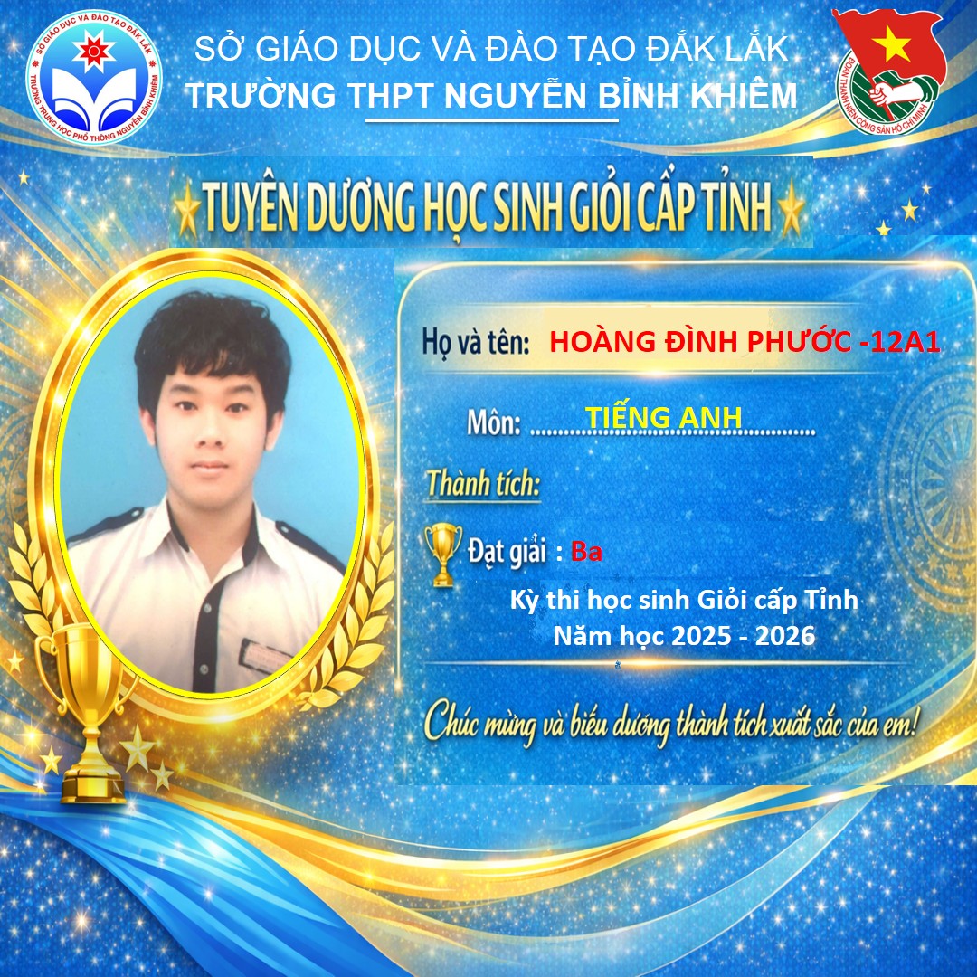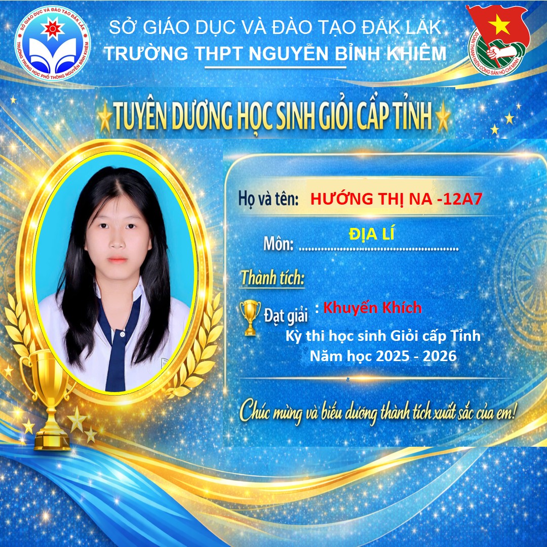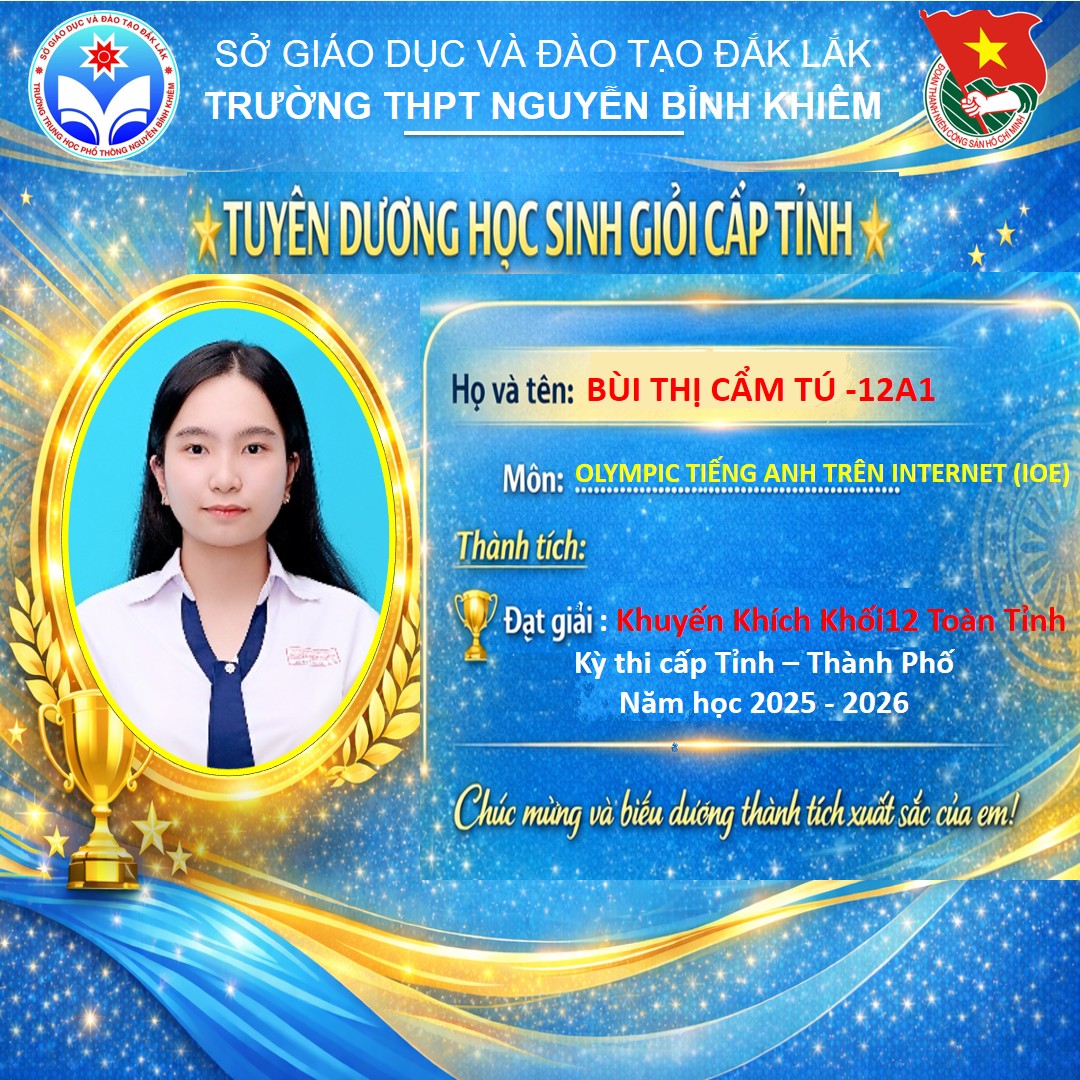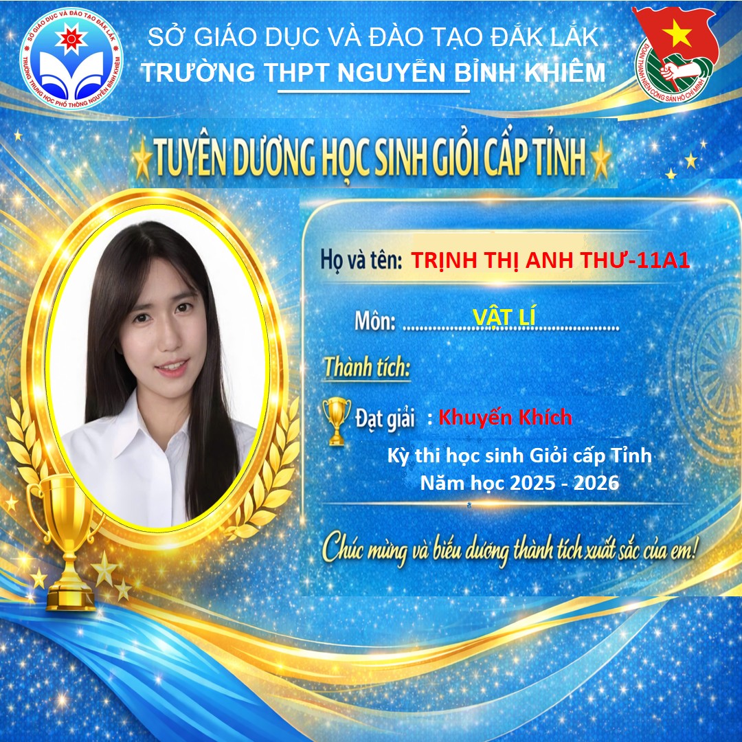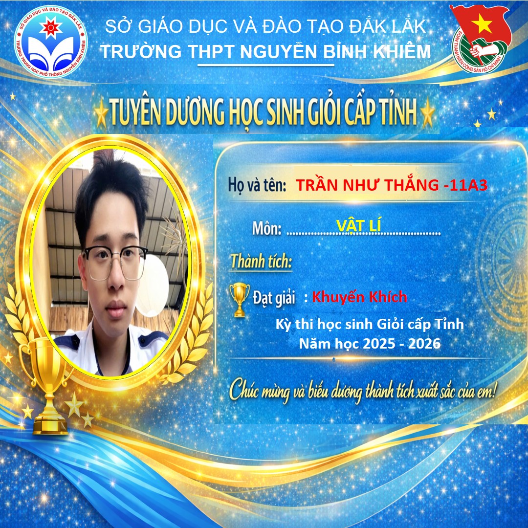 Hòa chung không khí thi đua sôi nổi của tuổi trẻ cả nước, sáng ngày 26/03/2026 Trường THPT Nguyễn Bỉnh Khiêm đã long trọng tổ chức LỄ KỶ NIỆM 95 NĂM NGÀY THÀNH LẬP ĐOÀN TNCS HỒ CHÍ MINH (26/3/1931 – 26/3/2026) và TUYÊN DƯƠNG HỌC SINH GIỎI CẤP TỈNH trong các kỳ thi năm học 2025 – 2026.