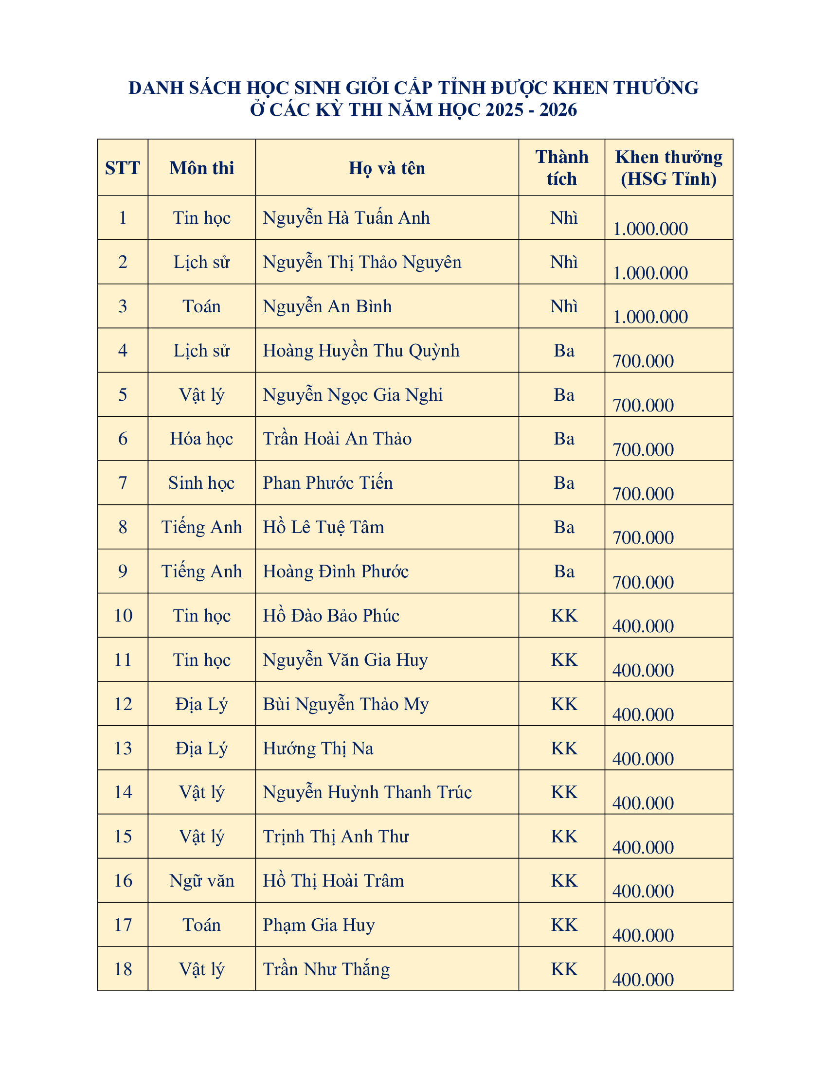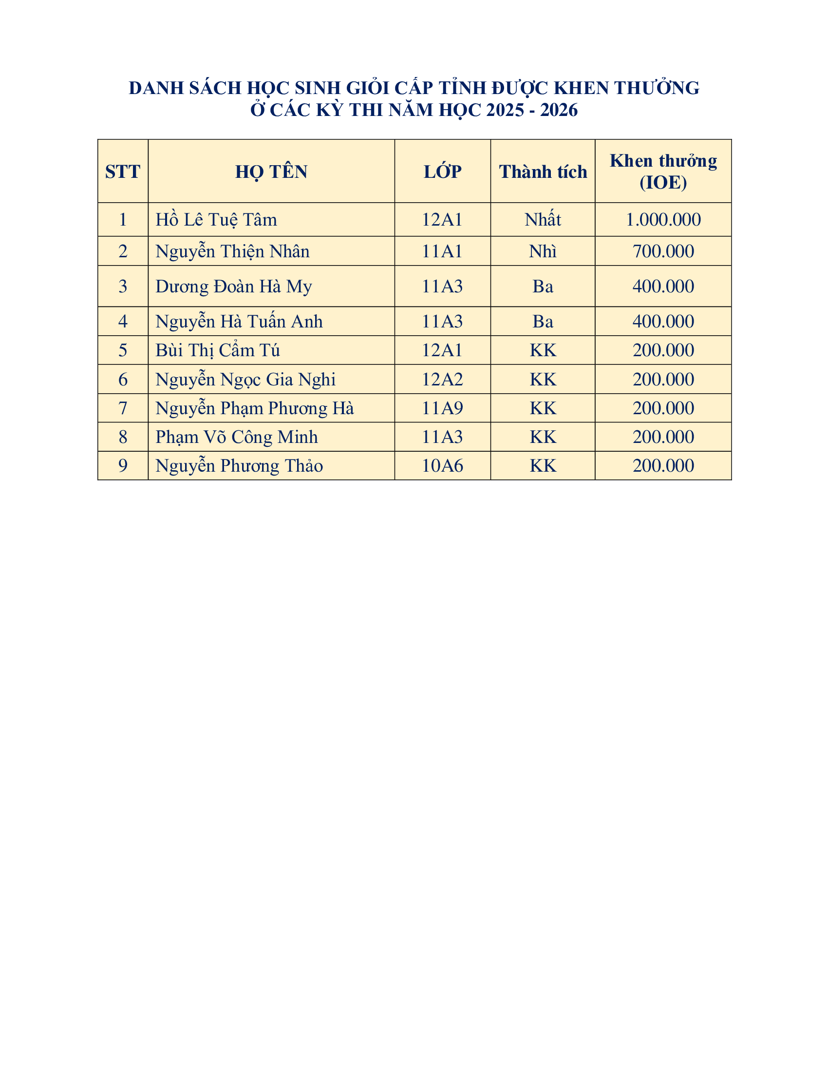 🏆 TUYÊN DƯƠNG HỌC SINH GIỎI CẤP TỈNH NĂM HỌC 2025 – 2026