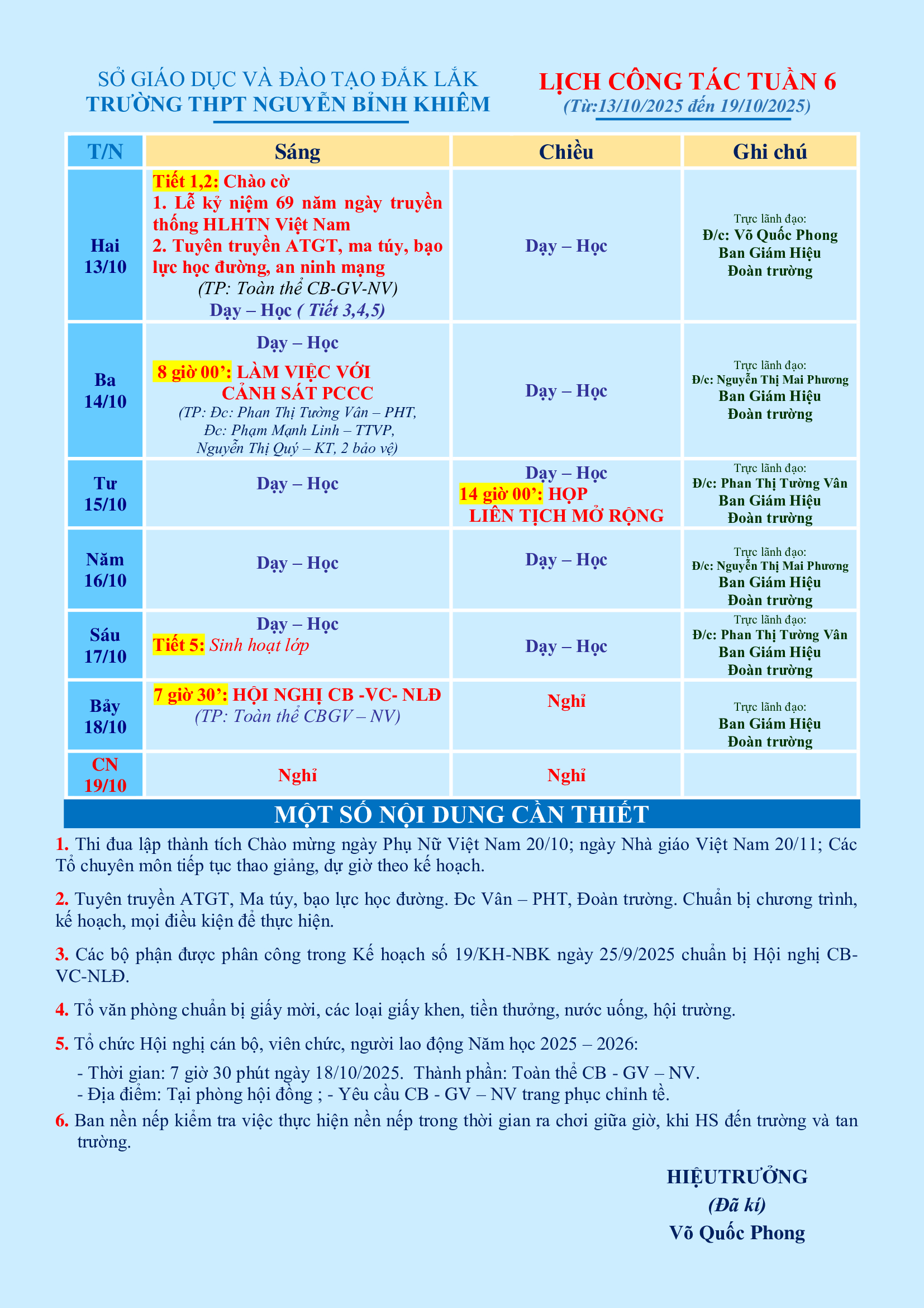 LỊCH CÔNG TÁC TUẦN 06 (từ 13/10/2025 đến 19/10/2025)