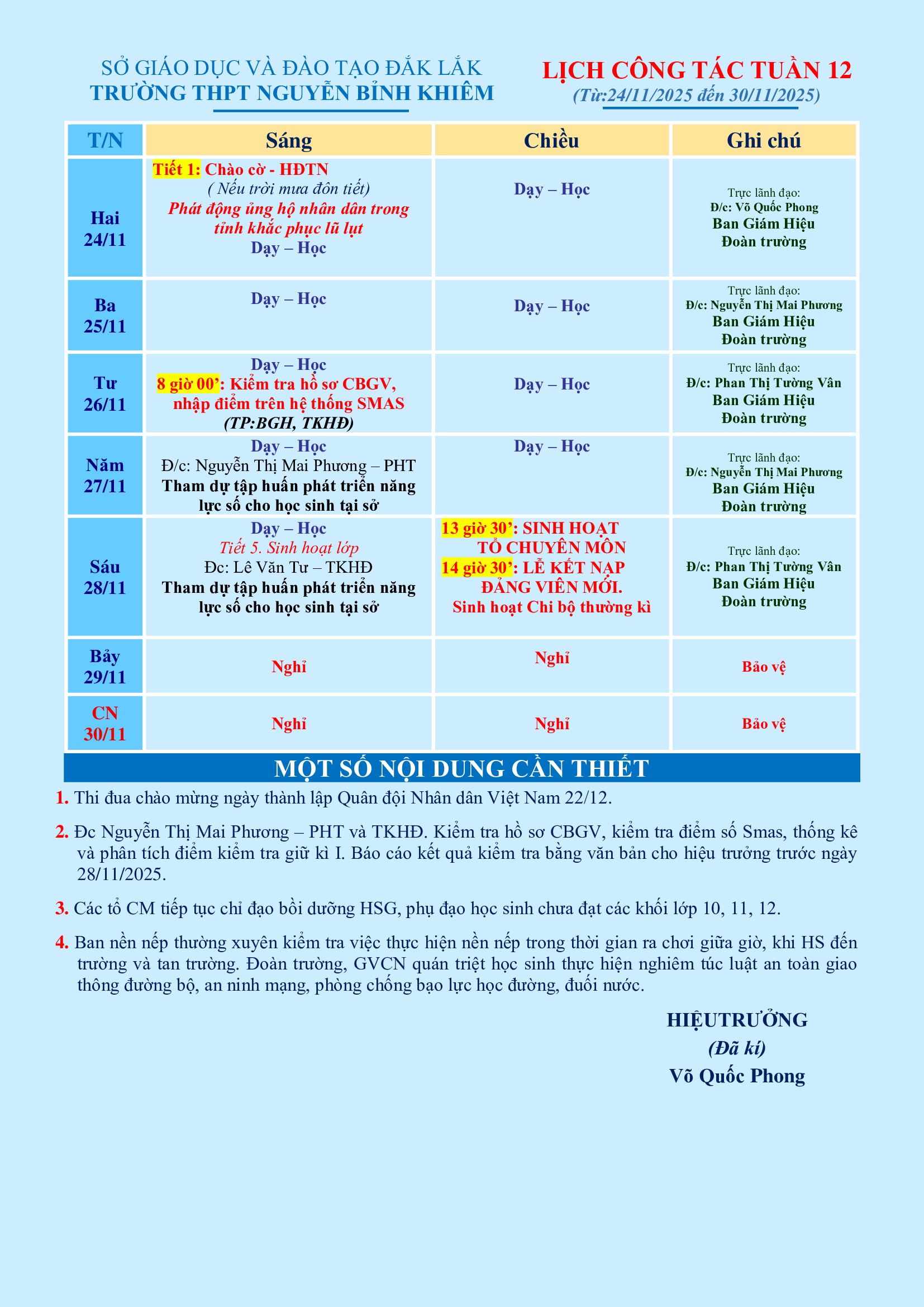 LỊCH CÔNG TÁC TUẦN 12 (từ 24/11/2025 đến 30/11/2025)
