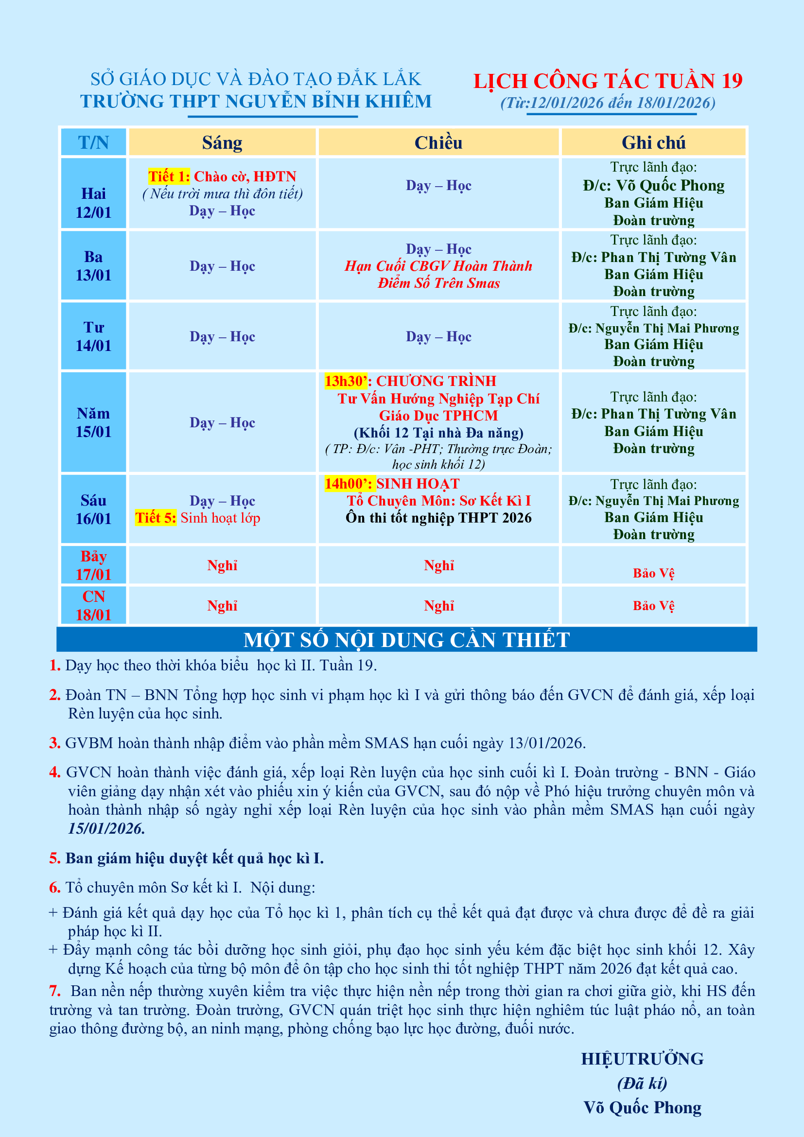 LỊCH CÔNG TÁC TUẦN 19 (từ 12/01/2026 đến 18/01/2026)