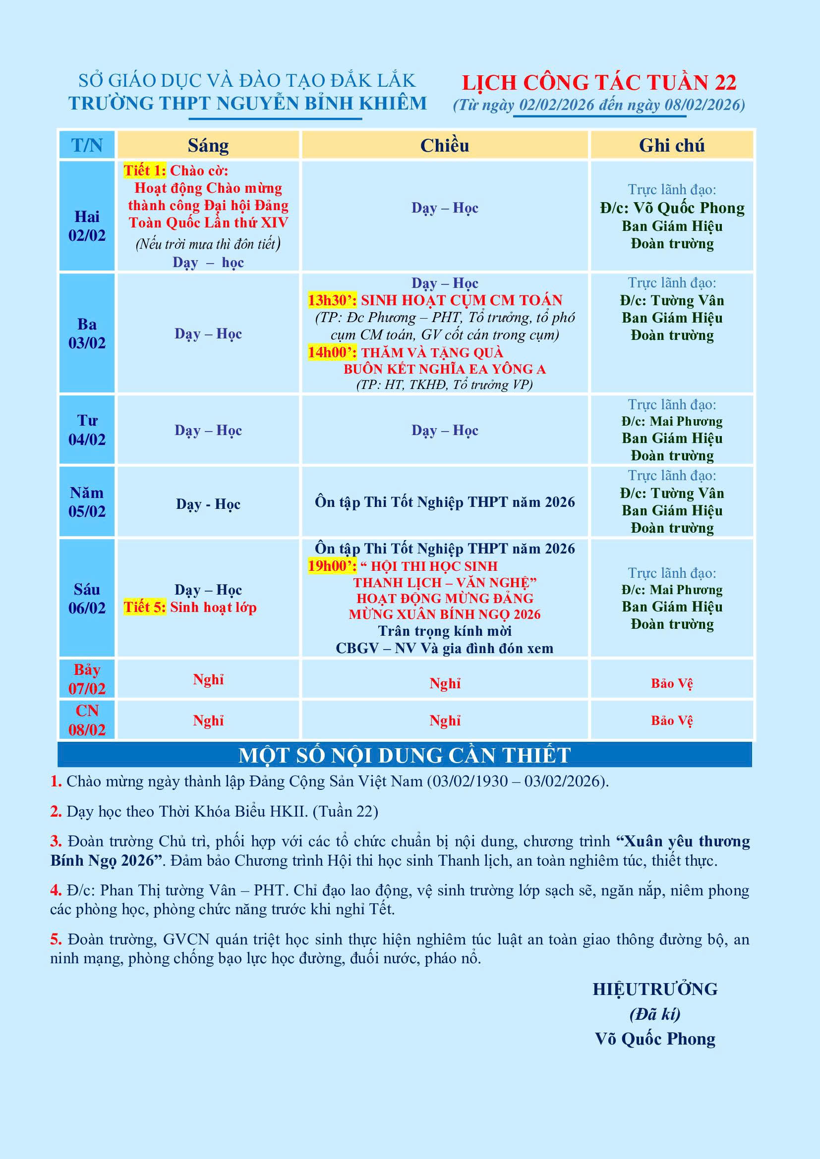 LỊCH CÔNG TÁC TUẦN 22 (từ 02/02/2026 đến 08/02/2026)