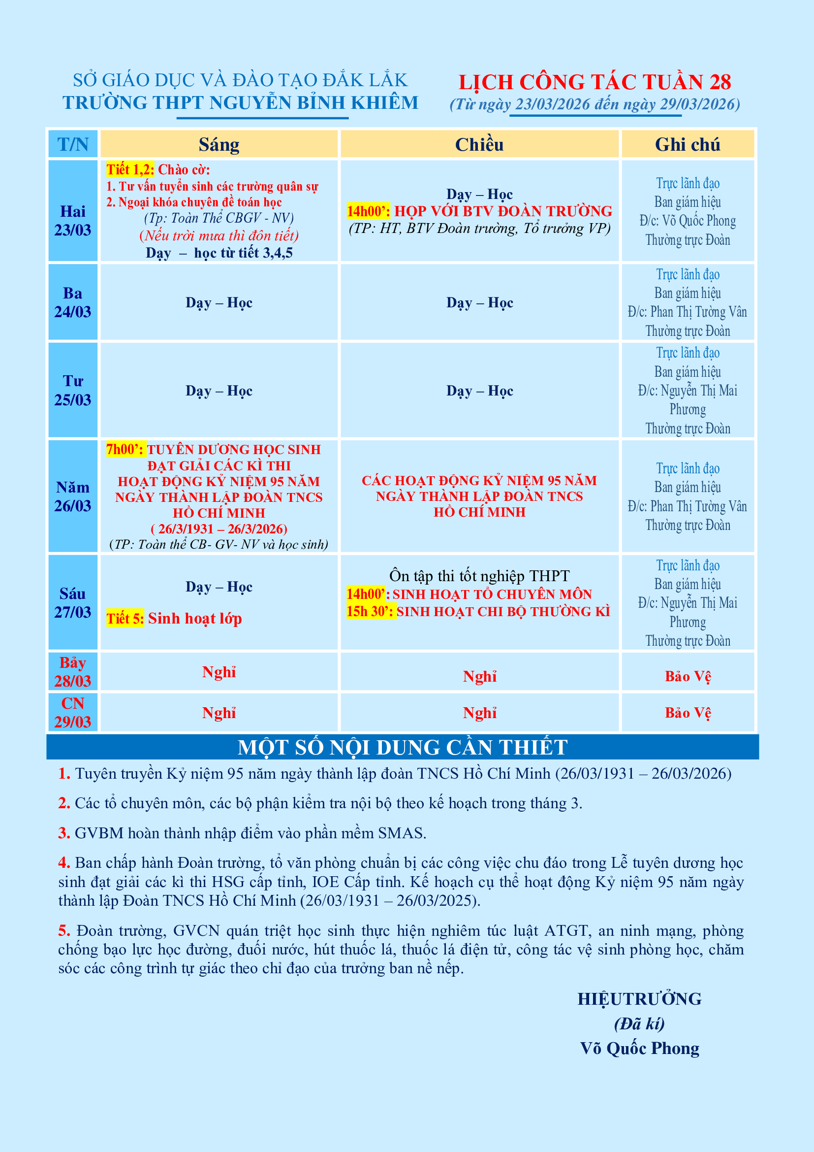 LỊCH CÔNG TÁC TUẦN 28 (từ 23/03/2026 đến 29/03/2026)