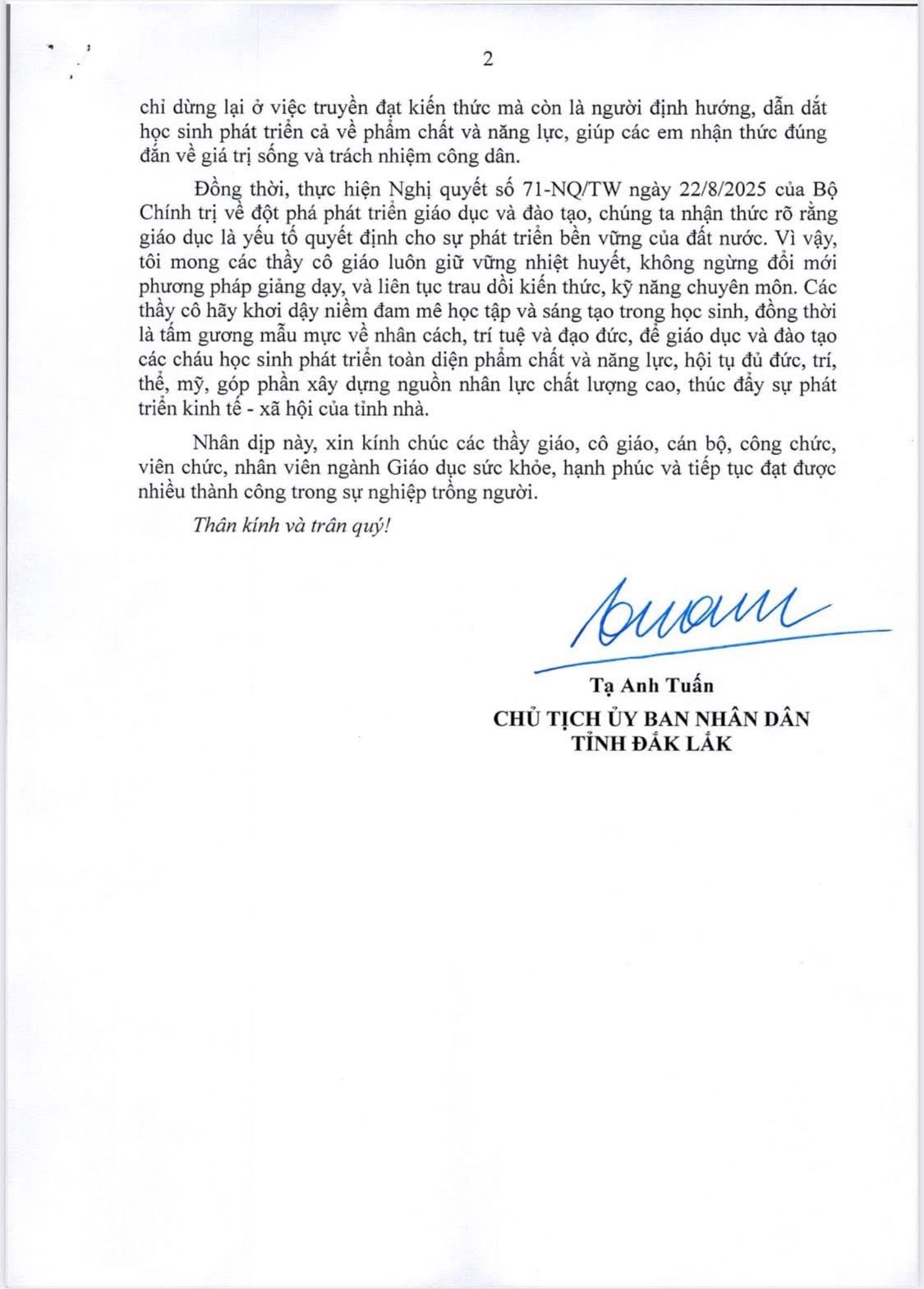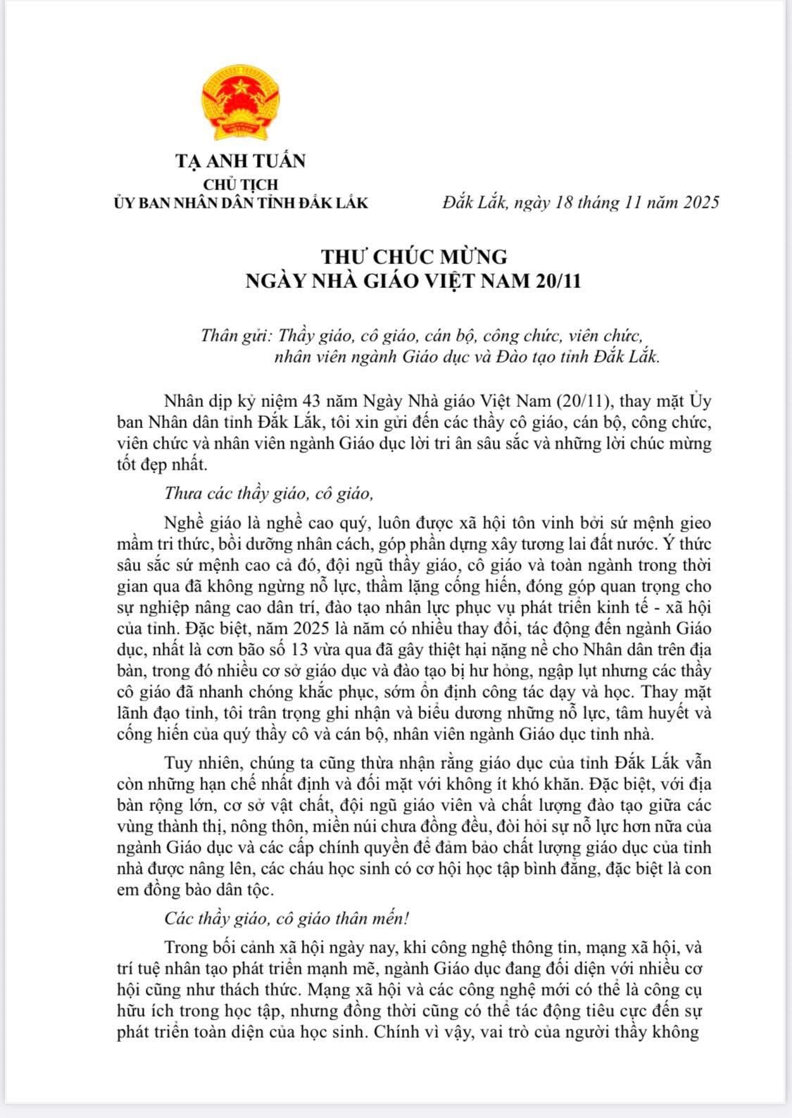 Chủ tịch UBND tỉnh Đắk Lắk gửi thư chúc mừng Ngày Nhà giáo Việt Nam 20/11